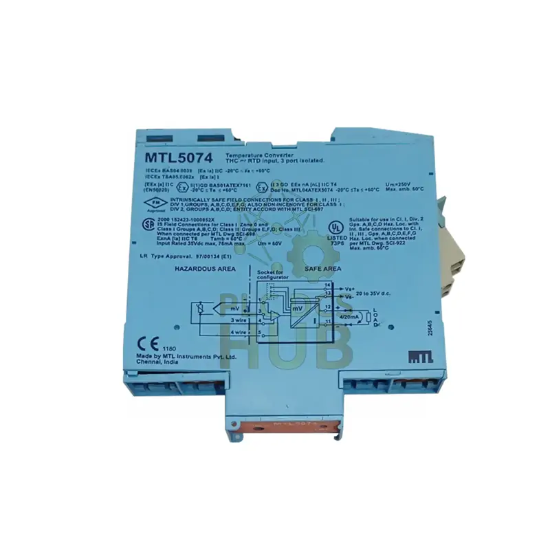 Convert temperature signals safely and accurately. The MTL5074 takes a low-level DC signal from a temperature sensor in a hazardous area and converts it into a robust 4-20mA current loop for your safe-area control systems. It offers software-selectable features like linearization, ranging, and alarm monitoring for a wide range of sensors.